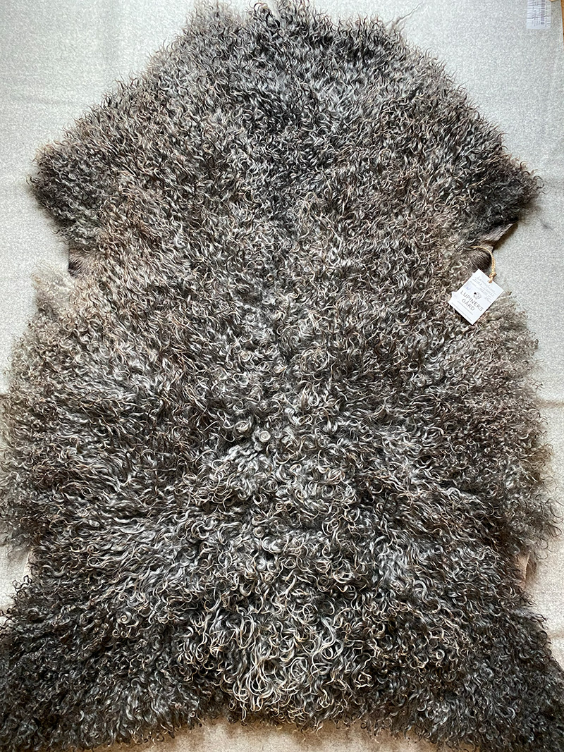 Lammskinn med den långa ullen kvar. Grå botten med ljusare toppar i bruna toner och ett virvarr av lockar.