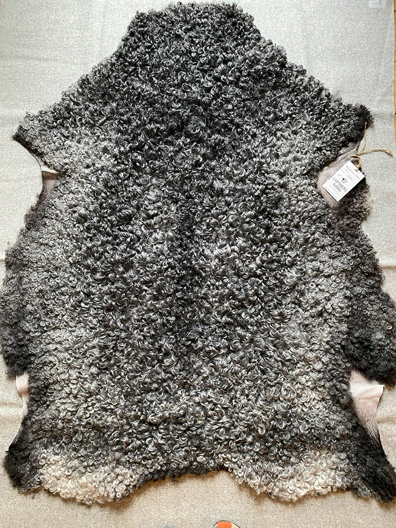 Ett mörkgrått skinn med mjuka jämna lockar. Ullängden är 35 mm.